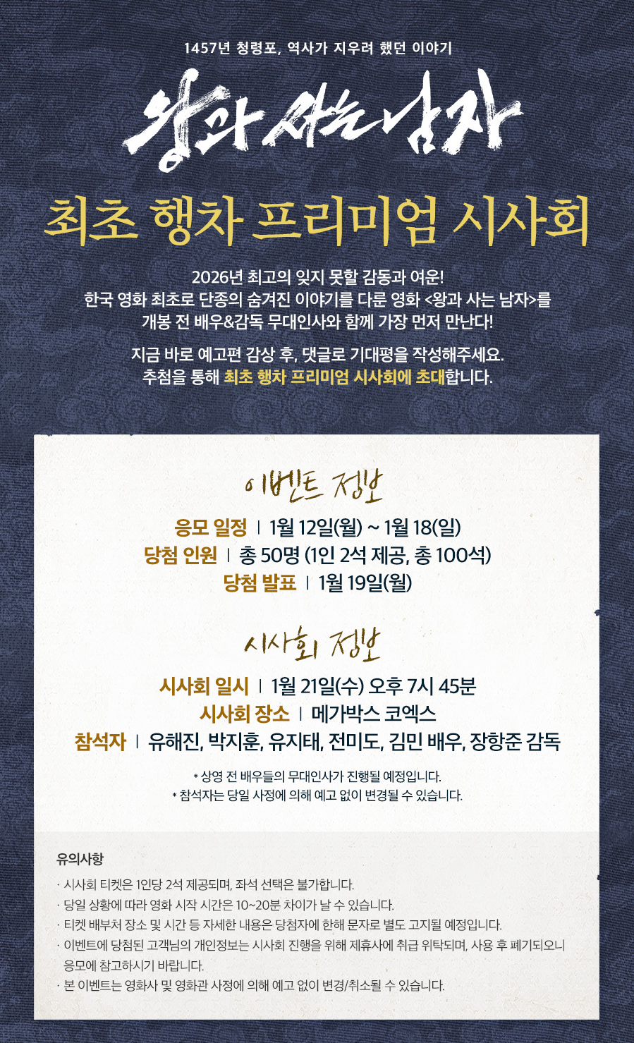 개봉 전에 만나는 행차! 🎥 《왕과 사는 남자》 프리미엄 시사회 응모 총정리(메가박스 코엑스)